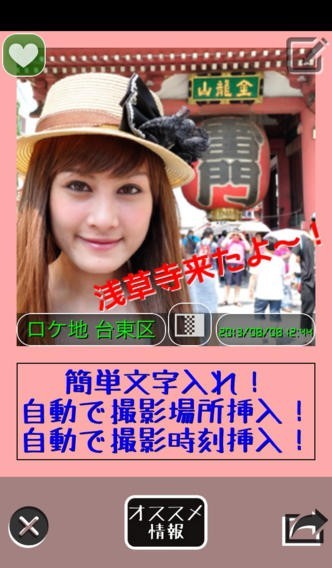 撮影した写真に文字を書き込むことができるアプリです。文字は69種類のフォント、56種類の色から選ぶことができます。フレームの色も56色用意されているので、自分だけの組み合わせを作れます。写真には撮影場所や撮影日時を表示することもできます。思い出の写真にメッセージを書き込むことでさらに愛着が増します。 12種類のフィルタで写真をセピア調や白黒漫画風にしたり、目をハートにするなど様々な写真の加工が可能です。SNSへも簡単に投稿できるので友達同士で盛り上がれます。