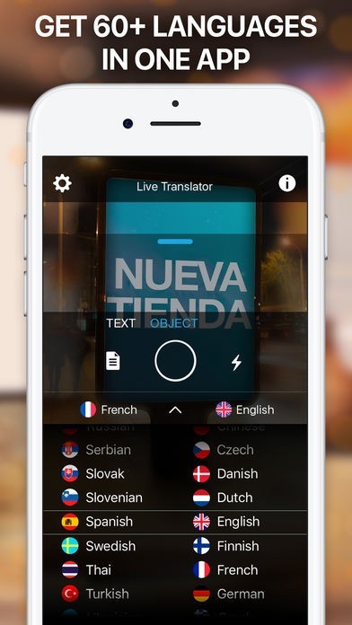 Live Translatorは標識や看板など建造物に書かれている文章をスキャンするだけで素早く翻訳してくれます。60以上もの言語が翻訳可能で検出したい言語と翻訳したい言語を選ぶ事ができます。