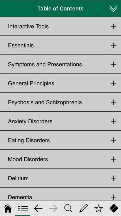 The content of the newest version of our Psychiatry app is presented using a new, innovative user interface that is elegant, intuitive and simple to use. Features include gesture-based navigation, bookmarking and annotation functions, indexed and full text searching, support for iCloud backups, and numerous interactive psychiatrics scales and scores.