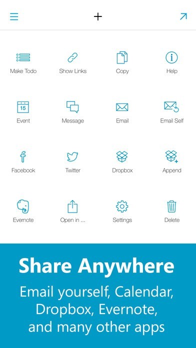 - Export notes to anywhere: Send notes via email, SMS, iMessage, Twitter, Facebook and any app that can receive text on your device.