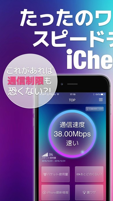 スマホを使う上で通信使用量やバッテリー残量は死活問題です。そんな問題を「サクサクチェッカー for iPhone - iChecker」が解決してくれます。 タップ1つで残りの通信量を即座に表示してくれ、それでどの程度のことができるかを教えてくれます。設定さえしておけばプッシュ通知でも知らせてくれます。 バッテリ関係についても同様の簡単操作で、空になるまでの時間を表示してくれたり、充電時に使用するとフル充電にかかるまでの時間を表示してくれるため時間を気にして焦ってしまうなんてこともありません。 また、wifiや外出先での使用で通信速度が気になった時に、素早く現在の速度を計測する機能も付いています。