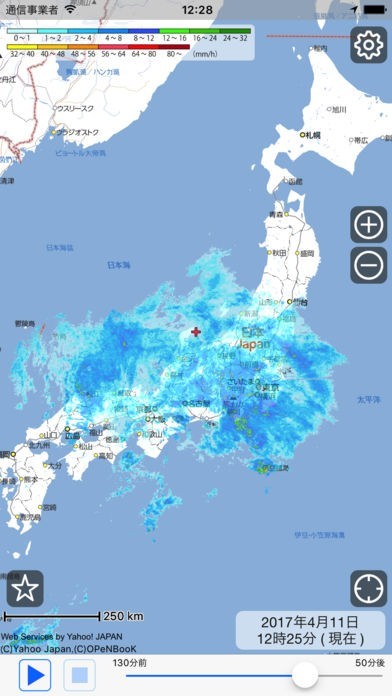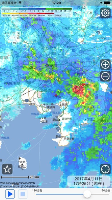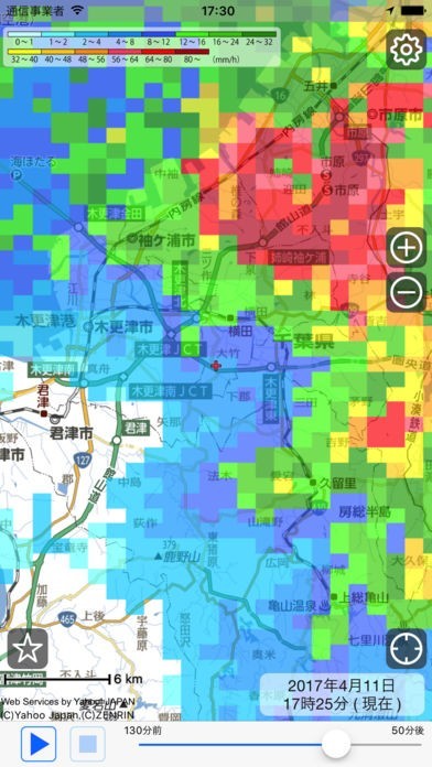 雨雲の動きをリアルタイムで知ることができます。過去二時間のデータも閲覧可能。