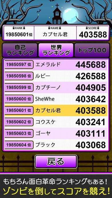 「ゾンビ撃て」は、次々とやって来るゾンビをひたすら撃ちまくるカジュアルゲームです。対ゾンビ用として3つのショットボタンを用意。一番近いゾンビから狙ってショットボタンをタップしましょう。ゾンビのスピードがアップすると難易度も上昇。タイミングよくショットを続けることで、ゾンビの到着を避けることができます。ゲーム終了後にはランキング機能で自己ランキングが確認できるため、前回よりも高いスコアを狙ってやり込めるのも楽しいポイント。また、世界ランキングでは他ユーザーのスコアが確認可能となっており、放課後や休憩時間などに友達とスコアを競い合ってワイワイ盛り上がることもできます。