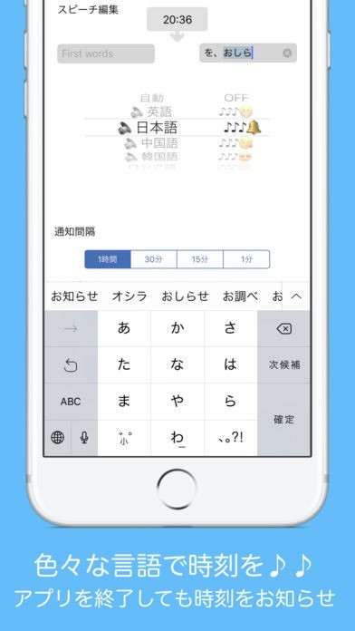 音声でアナウンスされる時間の告知の言葉を編集することができます。音声の声質を女性、男性のボイスに切り替えもでき、気分に合わせて飽きの来ない時報をカスタマイズして楽しむことができます。