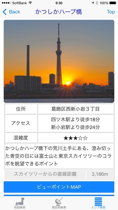 地図からビューポイントを検索します。地図上のアイコンをタップすると、ビューポイント名が表示されますので、そこをタップするとビューポイント情報が表示されます。