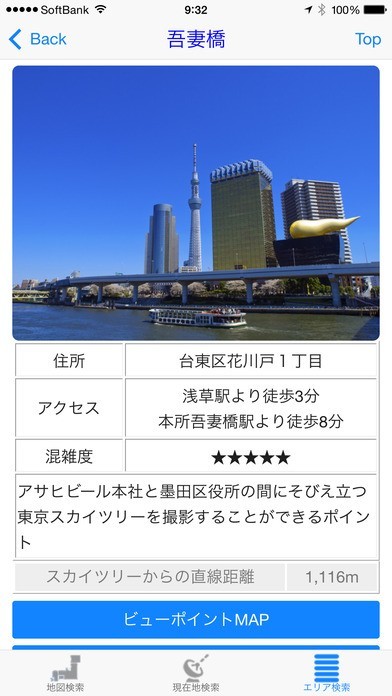 この『東京スカイツリーMAP』は、地図や写真とともに、高さ634mの世界一高いタワー「東京スカイツリー」のビューポイント/撮影ポイントを紹介するアプリで、