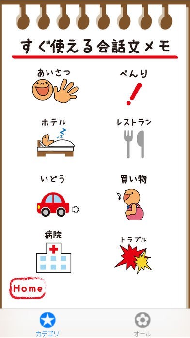 あいさつや買い物など使う場面ごとにフレーズがカテゴリ分けされているので、場面に応じた使えるフレーズをすぐに探し出すことができます。画面下の「カテゴリ」をタップすると、カテゴリを表示できます。