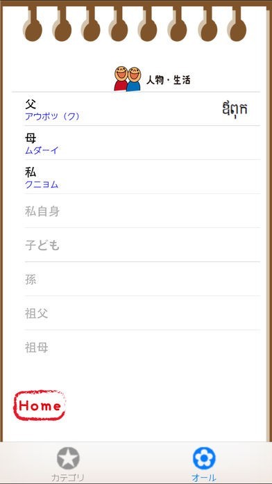 単語集では日本語に相当するクメール語の単語を確認することができます。クメール文字による表記も併記されているので、意味を知るだけでなくクメール文字の勉強に使うこともできます。