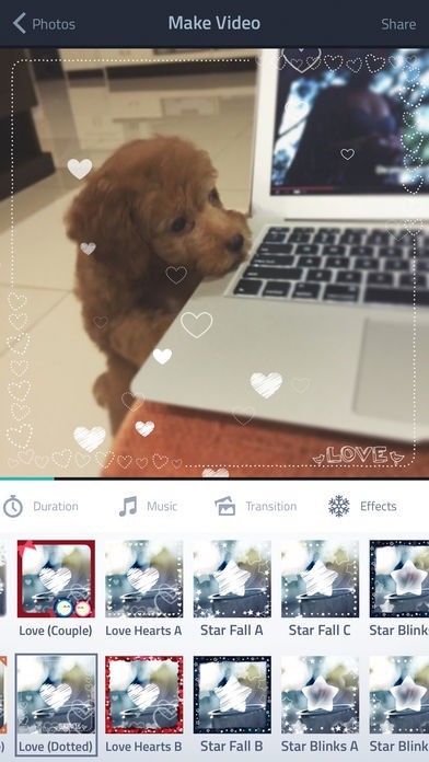 星やハートといった白い枠線を静止画の外側に載せることができます。そのため種類が違うものも同じフレーム内でミニムービー風に加工でき、静止画で思い出を印象的に見せます。