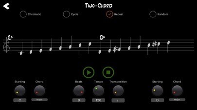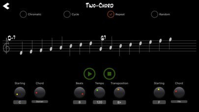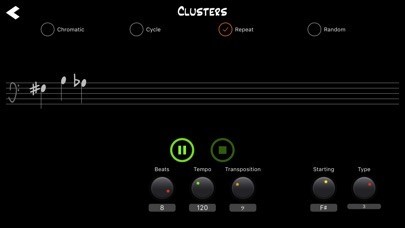 Clusters is a great way to exercise your ability to improvise over unexpected sounds. Here, the app will challenge you with randomly generated clusters (2-note, 3-note or 4-note) and morph them through the selected root movement. This is a great way to improve your hearing and response time to surprising chordal sounds.