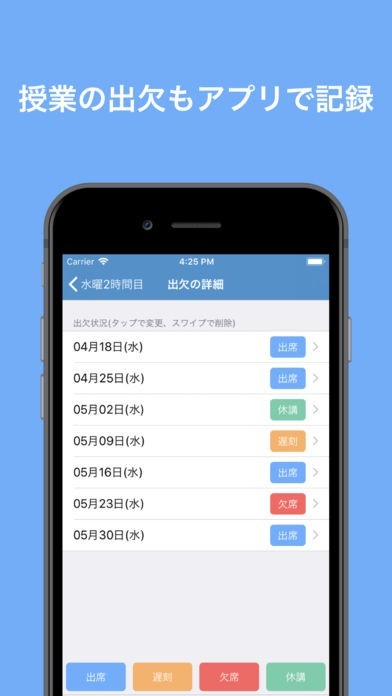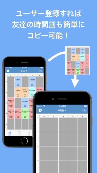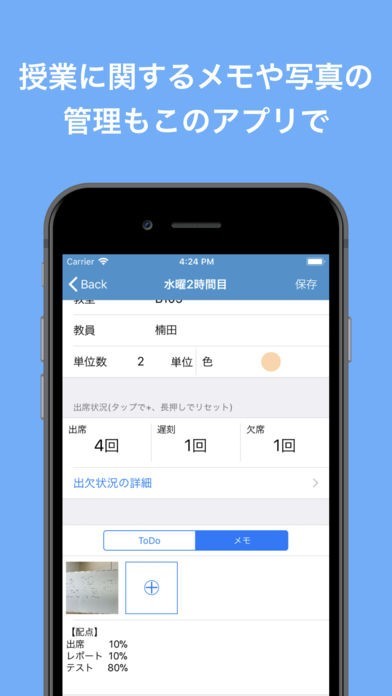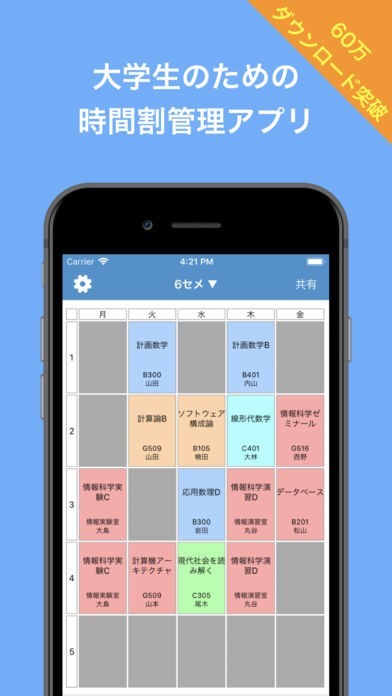 スマートフォンから時間割表を作成することができるアプリとなっていて、教室名や教官名、休講情報などを入力しておくことでテストやレポート忘れなどを防ぐことができます。