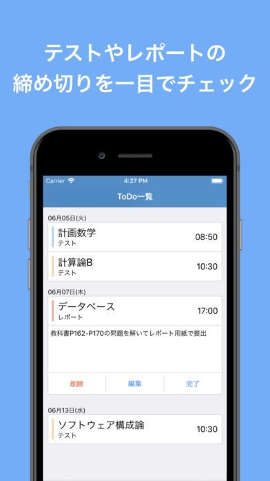 大学の時間割、レポートの締切、出欠の確認などを行うことができ、大学生活のスケジュール管理に便利です。