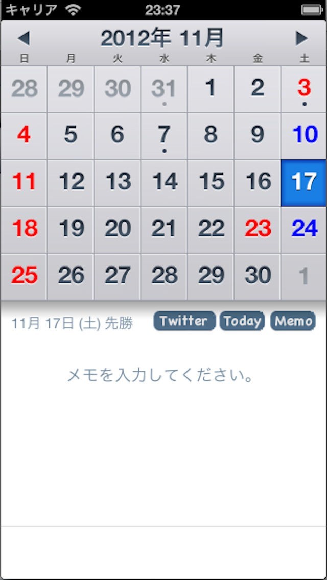 App Storeより引用◎ カレンダーで本日及びある日の選択、思いついたことを簡単にメモが出来ます。さらに書いたメモをその場でツイッター出来ます。