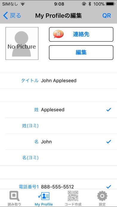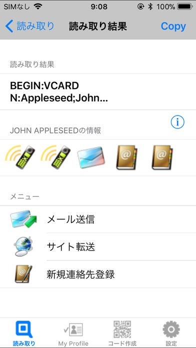 自分の住所や電話番号、メールアドレスなどの情報のQRコードが作成可能です。友人や取引先との電話帳交換はもちろん、不測の事態のバックアップとして作成しておいても便利ではないでしょうか?