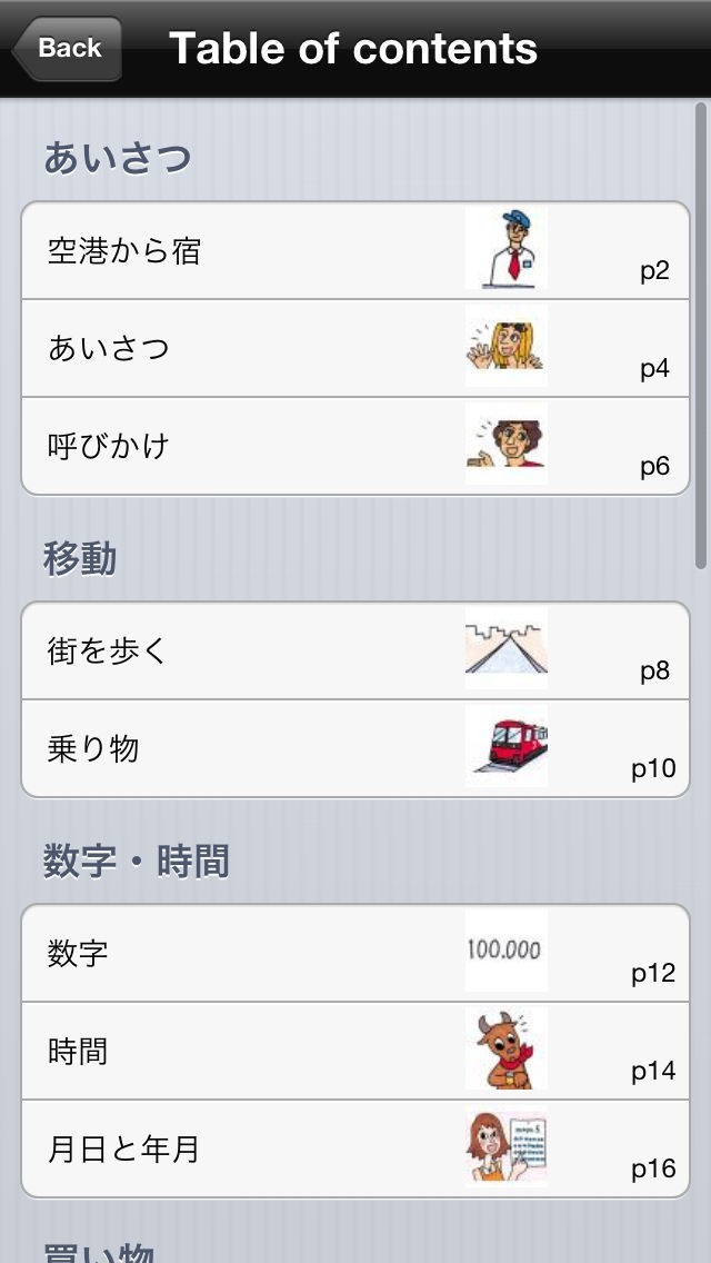 あいさつや食事、トラブルなど22シーンに1300のフレーズが分類されているので、シーンに合わせて必要なフレーズを簡単に見つけることができます。フレーズにはイラストも付いているので分かりやすいです。