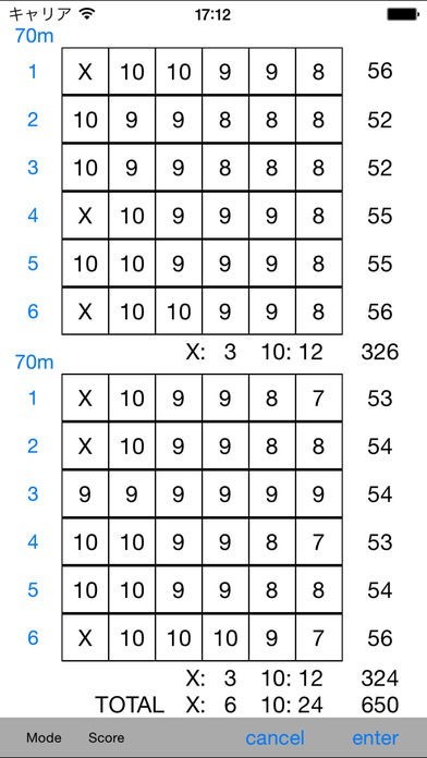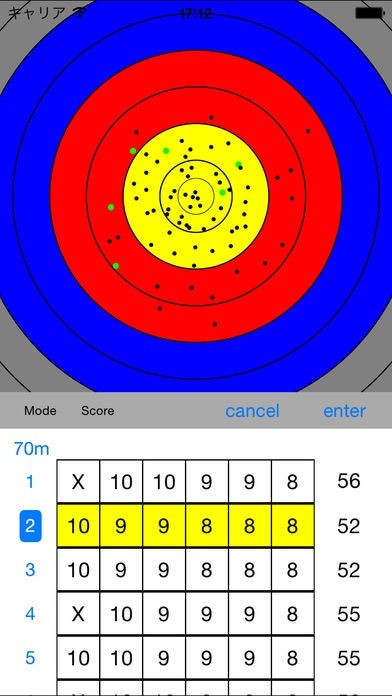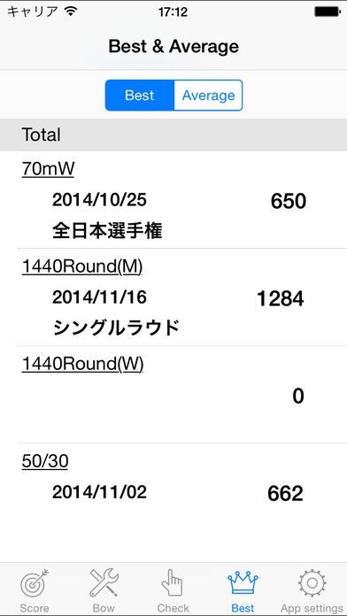 アーチェリーのスコアが記録出来るようになっています。過去の得点をまとめて表示させる事が可能なので、分析を行いたい時にも役立つでしょう。アベレージを自動で算出してくれるのも利点ですね。