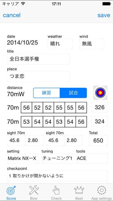 弓具のセッティング情報やチューニングデータが保存出来るようになっています。さらに当日の風速や天気を記載する事が可能で、大会別にスコアを管理出来るのも特長ですよ。