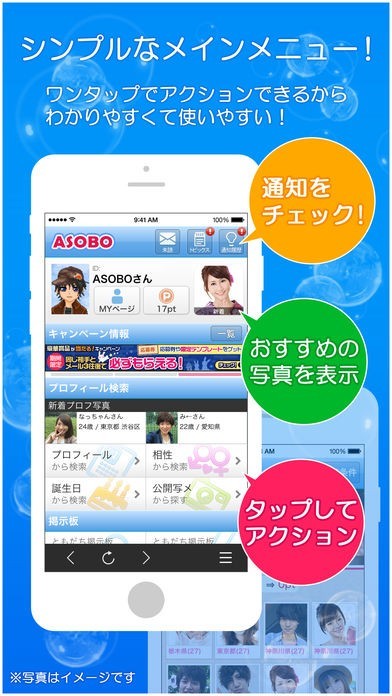 「ASOBO i BROWSER」とは iPhone専用の出会い系アプリです。性別に関係なく無料でインストールすることができます。同じ趣味の友達がほしい、彼氏や彼女がほしい、結婚相手を探したいなどさまざまな方に利用していただけます。画像のアップ、年齢確認を簡単にできます。画像や年齢確認がされているので安心して利用できるのではないでしょうか。さまざまなコンテンツも用意されています。ぜひ、積極的にアプリを使って好みの相手や素敵な出会いを見つけませんか?