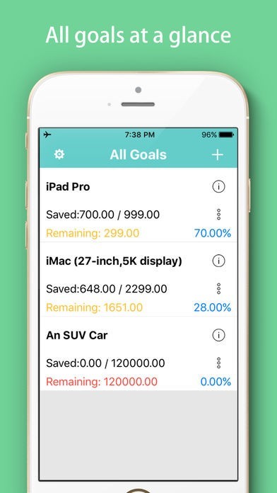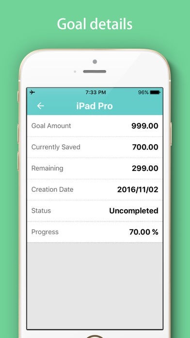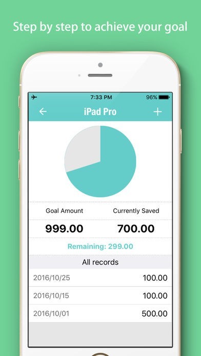 •貯蓄目標を設定した後、あなたの預金額を追加し、その後、量、割合(現在の預金/目標量)、および非常に直感的な方法を残り、保存された金額を見ることができます。