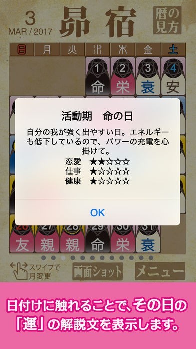 総合は切り替え機能で、日運と月運、年運の吉凶を見れます。カレンダーでは、見たい日付をタップするとその日の吉凶や解説文が表示します。様々な運勢を見て参考にできます。