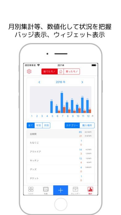 - タブタップで集計切替(年月、カテゴリー、購入場所)