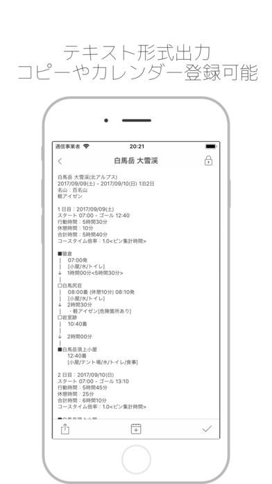 作成した登山プランをメンバーと簡単に共有することができます。GoogleやiCloudなどのクラウドサービスでの共有から、テキスト出力で印刷しての配布まで対応しています。