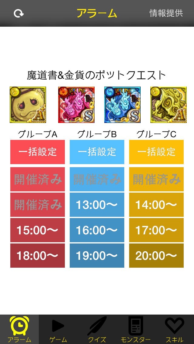 アプリケーション側が公式アプリの魔導書&金貨ポットクエストをアラームで教えてくれるので、貴重なクエストを知らぬ間に逃すという事態を避けることが可能となっています。