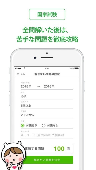 自分の設定した条件で問題を選択できるので、気になる過去問は歯科医師国家試験の当日まで何度も解くことができます。