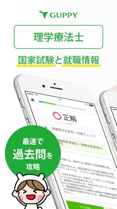 App Storeより引用理学療法士 国家試験&就職情報【グッピー】は、理学療法士国家試験対策と就職活動が同時にできるアプリです。