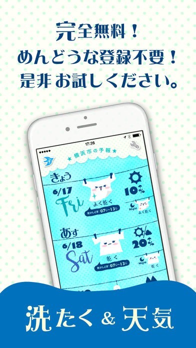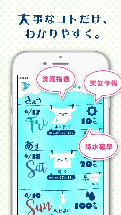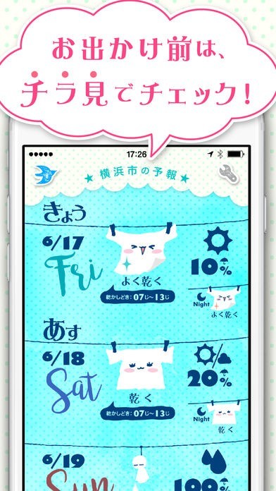 一目で洗濯物指数わかるかわいいイラストが特徴で日々の生活をサポートしてくれます。すぐに乾くかが一目でわかるので忙しい人でも簡単に確認することが可能で非常に便利です。