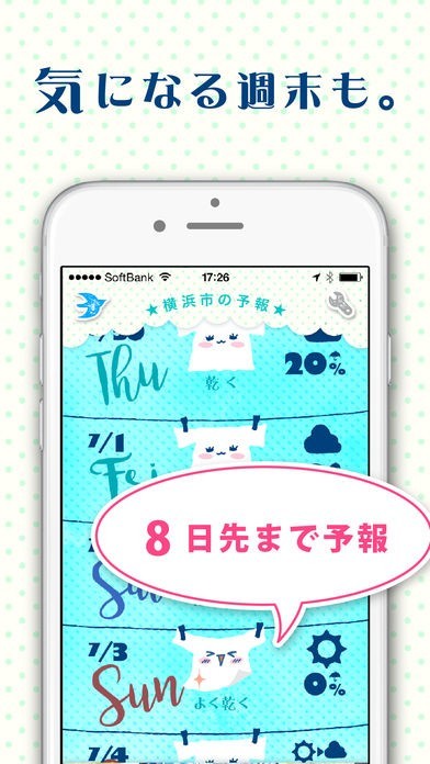 週間天気はなんと八日間表示可能なので長期の旅行の際にも予定が立てやすいです。かわいいイラストと同時に一目で洗濯指数がわかるので家事をする人たちにとってのとても心強い味方になること間違いなしです。