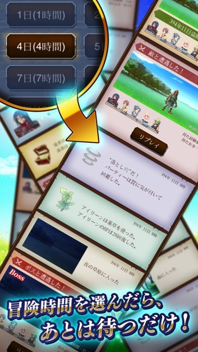 冒険者を雇い、装備を整え冒険に出したら後は待つだけ。ボス戦闘はコマンドバトルを楽しめる放置気味RPG!