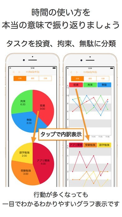 自分がそれぞれの行動に要した時間がムダだったか有益だったかをあとからチェックすることができ、1日の中でどの時間帯がムダになっているか、どうすればもっと効率よく動けるか考えるのに役立ちます。