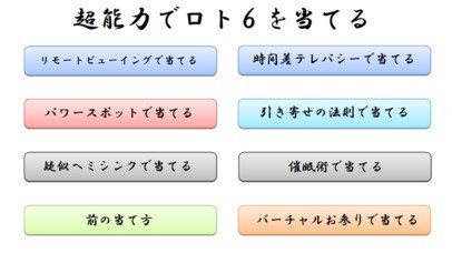 超能力選択機能が搭載されており、「リモートビューイング」「パワースポット」「引き寄せの法則」といった様々な方法から選ぶ事が可能です!選択後に指示された方法を試せば超能力が高まり、ロト6当選まで近づくかもしれません!