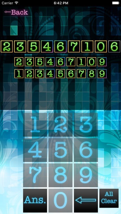 選んだ数字が問題に含まれ、桁まで合っていたら枠が虹色に変わります(ヒット)