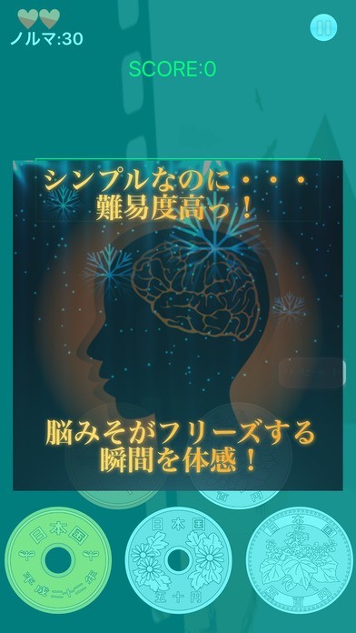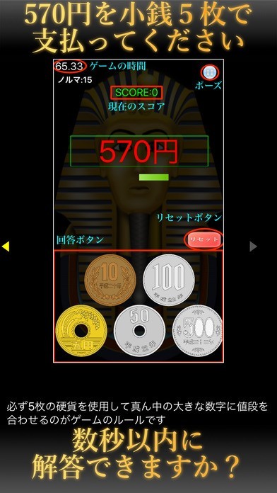 5、10、50,100,500の5枚の硬貨を使って遊ぶパズルゲームです