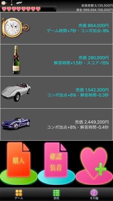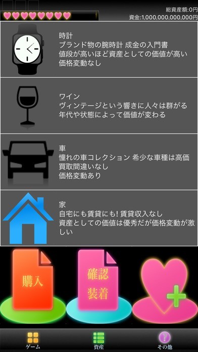 ゲームをクリアすると獲得できる「資金」を使って資産となるアイテムを購入できます