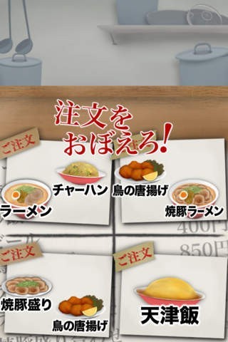 「ウチの注文とってみろ!」は時間制限付きの瞬間記憶のゲームアプリです。構成はラーメン屋でウエイターなあなたがお客様から受けた注文をできた料理から正確にお客様の元へ運ぶ(タップするだけです)ゲームです。慣れてくるとメニューの種類が増えてきますので素早く対応していきましょう。うっかり注文を間違えたり、悩んで遅くなったりするとお客様が待ちきれずに帰ってしまい、あなたの時給が下がってしまいます。お客様を満足させてベテランのウエイターを目指しましょう。