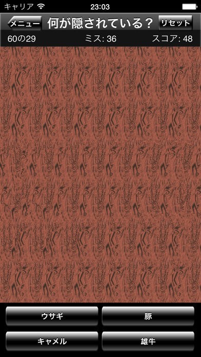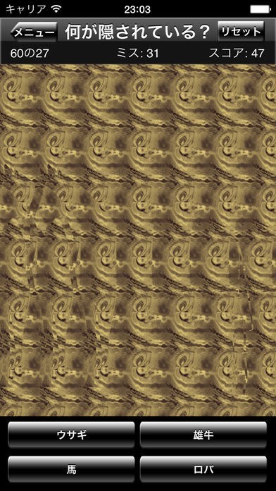 アプリには60種類のステレオグラムを収録しており、各設問の絵中には動物が隠れています。見方のコツを掴めば立体的に浮かんでくる動物が何かわかるはずです。さて、どんな動物が隠れているのでしょうか?