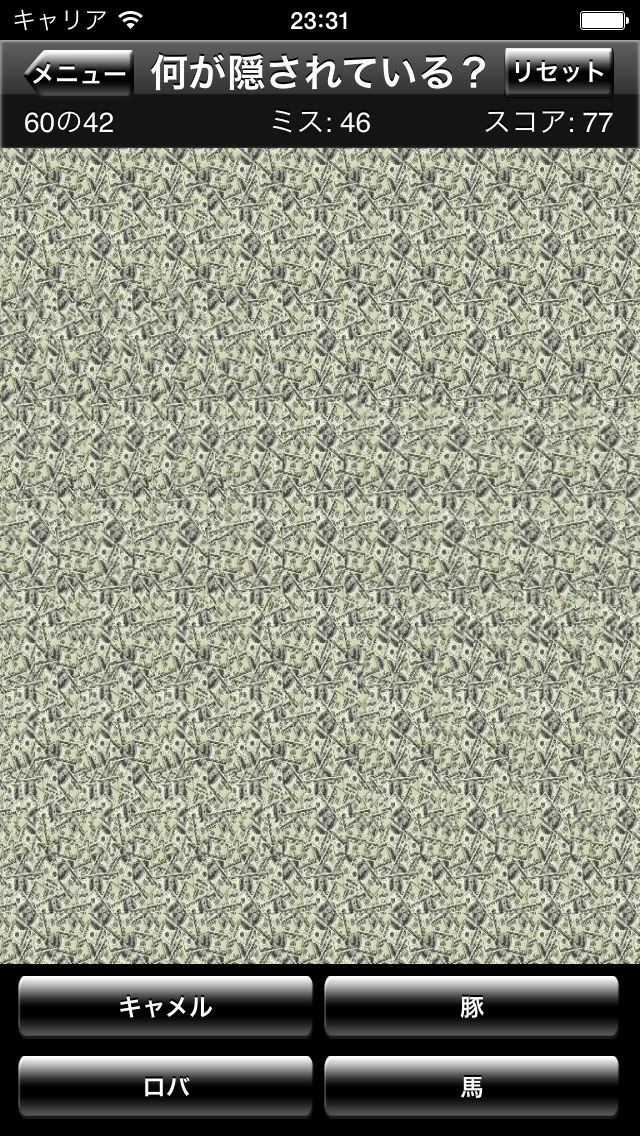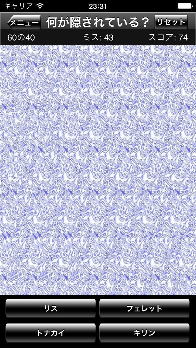画像が見え始めるまで凝視するだけで徐々に画像が見えてくる画像アプリで、シンプルな作りが好評なアプリとなっています。画像内に隠れているものに答えるクイズアプリとなっています。