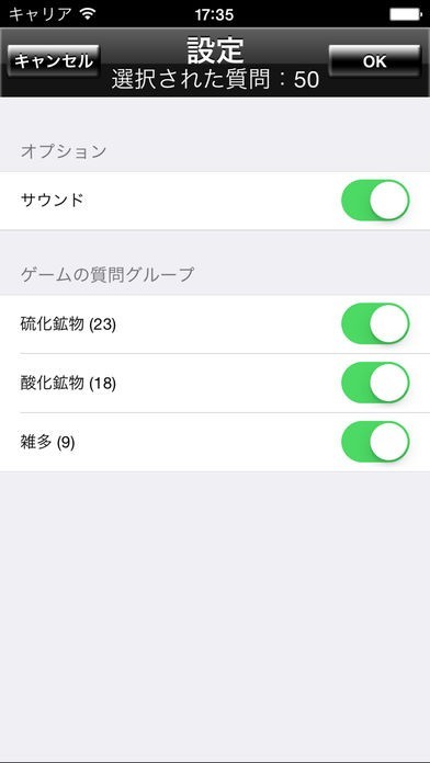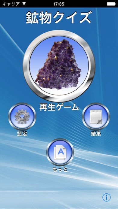 鉱物は主に2種類、酸化物と硫化物です。もし、あなたが、酸化物の鉱物だけクイズでやりたいと思えば、他の鉱物の問題を取り除いた問題集で遊ぶことが出来ます。また、アプリ内で流れる曲もON、OFの切り替えが出来、自分の好きな曲を聴きながら、問題を解く事も出来ます。