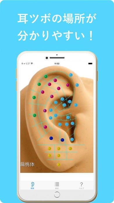 「耳つぼマッサージアシスト」は肩こりやダイエットなどボディメンテナンスをしたい時にどこでも耳つぼマッサージができるようにガイドしてくれます。 耳つぼの場所が画像で表示されていて、症状別にマッサージに必要な場所も知ることができます。 またタイマー機能が付いていてマッサージの時間も把握できます。