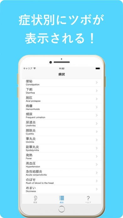 画面にタッチで耳つぼの場所がわかる!症状別にも調べられ必要なマッサージ場所を把握できる