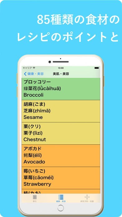 医食同源という言葉があります。バランスの良い食事を摂ることでそれは医療と同じような病気の予防や改善効果があるという意味の言葉です。そんな医食同源の手助けをしてくれるのがこのアプリです。身体に良い食材を85種類も掲載しています。
