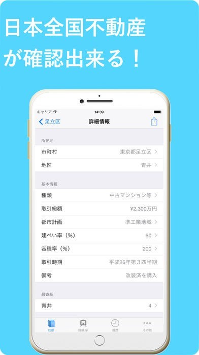 アプリには物件の詳細情報が掲載されているので、しっかりとチェックしておきましょう。住所や取引金額はもちろん、土地の都市計画、建ぺい率、容積率なども確認できます。購入を考えている物件の下調べになります。