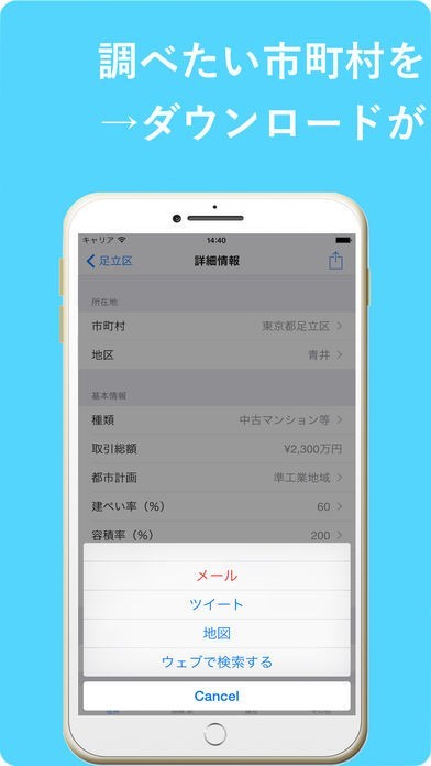 アプリで調べた取引価格情報をTwitterやメールで共有することができるようになっているので、土地の購入などを検討しているときにも素早く家族と相談することができます。