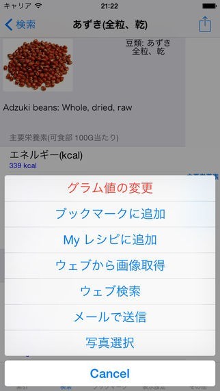 成分値算出機能が搭載されていたので、食品の成分もグラム単位で計算する事が出来ました