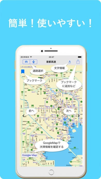 「Google Map」をタップすることによって渋滞情報を確認することが出来て、混雑に巻き込まれてしまうという嫌な事態を避けることが出来ます。 また、左上のシオリのようなアイコンのブックマークをタップすることによって次からすぐにチェックすることが出来ます。 まった、「高速道路」では、それぞれに電話をすぐにかけれるようにしてくれるので、もしものときは実際に電話して確認することも出来ます。 他には、道路画像によって、現在の道路状況を確認することが出来るので、特に冬に道路凍結などを確認したい場合にはとても便利です。
