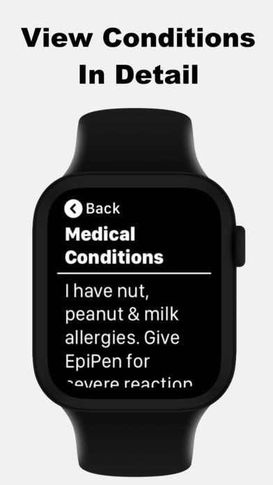 Without the need to unlock your phone, your MediWear medical ID can be displayed right from your Watch Face and with a tap, all of your details to be displayed to the person helping you.