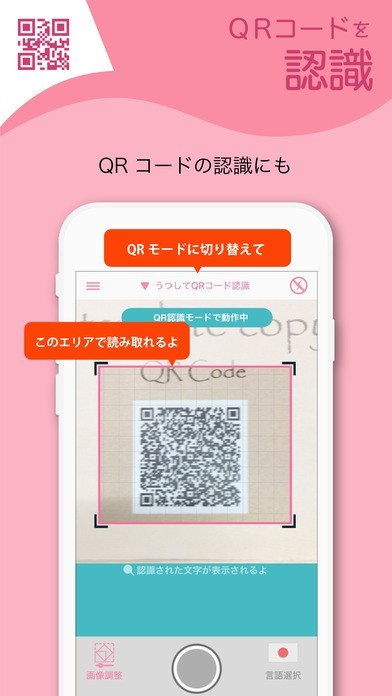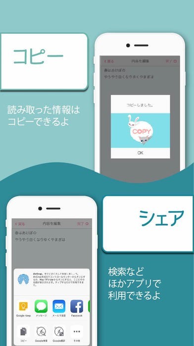 うつしてコピーは、カメラレンズを読み取りたい文字にまっすぐ向けるだけで、素早くテキストデータ化してくれるアプリです。対象の書類などを画面の認識用エリアに収めてタップでピントを合わせれば、読み取った文字がすぐ下のテキストエリアに表示されるので、正しく認識されていることを確認したら、シャッターを切るように確定ボタンを押してください。後は目的に合わせて、テキストを編集したり、クリップボードにコピーしたり、他のアプリで共有・検索・保存したりしていろいろ利用できます。便利なのは、文字だけでなくQRコードの読み取りもできたり、書類だけでなく写真や液晶画面からも読み取りができることです。